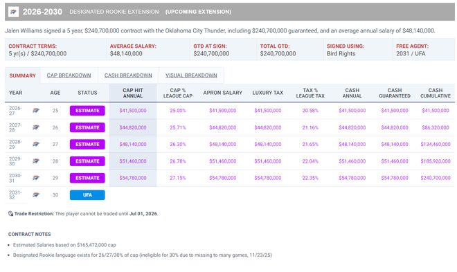 今夏雷霆与杰威达成提前续约,合同是五年2.407亿的顶薪合同,因为上赛季杰威是最佳三阵+最佳二防,他下赛季的薪水会高达4150万,但他在今夏接受了手部的手术,他直到11月29日才复出。